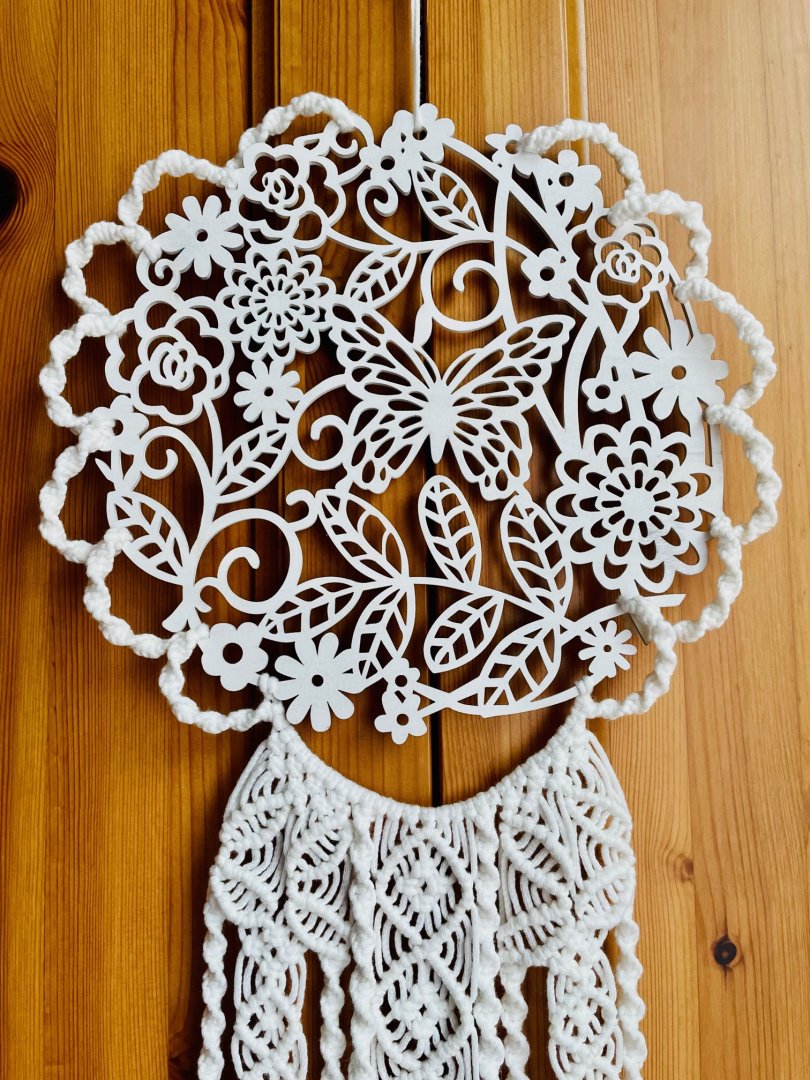 Zartes, weißes Makramee kombiniert mit einem hölzernen Blumenmuster.